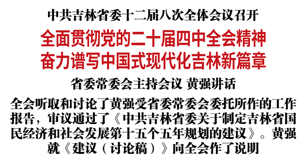 全会号召,全省广大党员干部群众要更加紧密地团结在以习近平同志为核心的党中央周围,抓住机遇、乘势而上,勇于创新、苦干实干,为圆满完成“十五五”时期经济社会发展目标任务、全面建设社会主义现代化新吉林而努力奋斗!